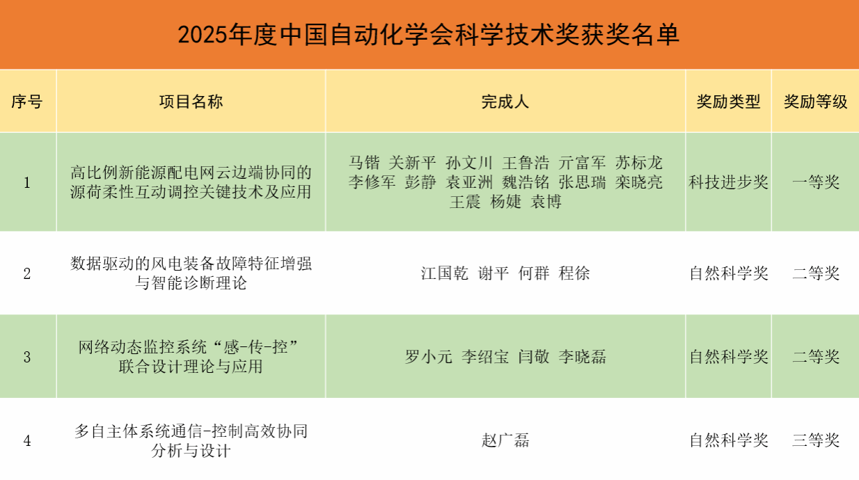 电气工程学院马锴教授主持完成的“高比例新能源配电网云边端协同的源荷柔性互动调控关键技术及应用”荣获科技进步一等奖;罗小元教授主持完成的“网络动态监控系统‘感-传-控’联合设计理论与应用”荣获自然科学二等奖;江国乾副教授主持完成的“数据驱动的风电装备故障特征增强与智能诊断理论”荣获自然科学二等奖;赵广磊教授主持完成的“多自主体系统通信-控制高效协同分析与设计”荣获自然科学三等奖。